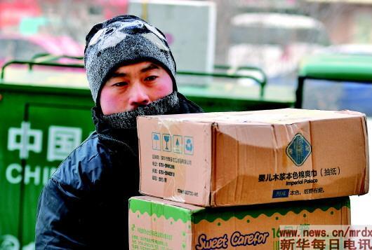 23日下午两点,哈尔滨市出现当日最高温度——零下24摄氏度。此时,穿着棉马甲、带着羊毛护膝的外卖小哥周瑞杰正气喘吁吁地将一份外卖送到哈尔滨市长江路上的一处办公大楼。“天冷,大家不太愿意出门吃饭,我一上午就送了20多份外卖,差不多是平时的两倍。”周瑞杰说。