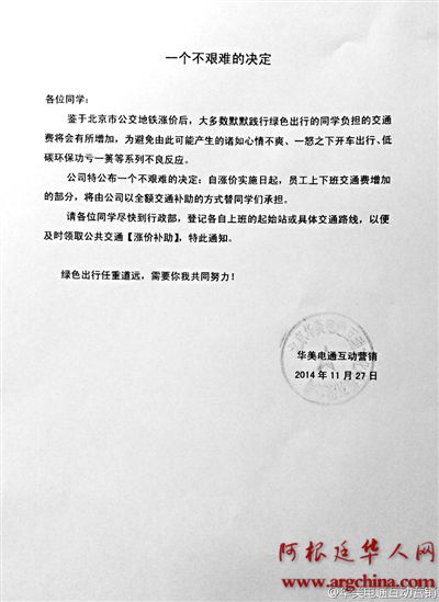 北京一公司发出的给员工发涨价补助的通知 公交地铁调价方案在11月27日正式公布,并将在本月28日正式实施。按照调价方案,通勤族平均票价将涨至4.3元,价格翻了一倍多
