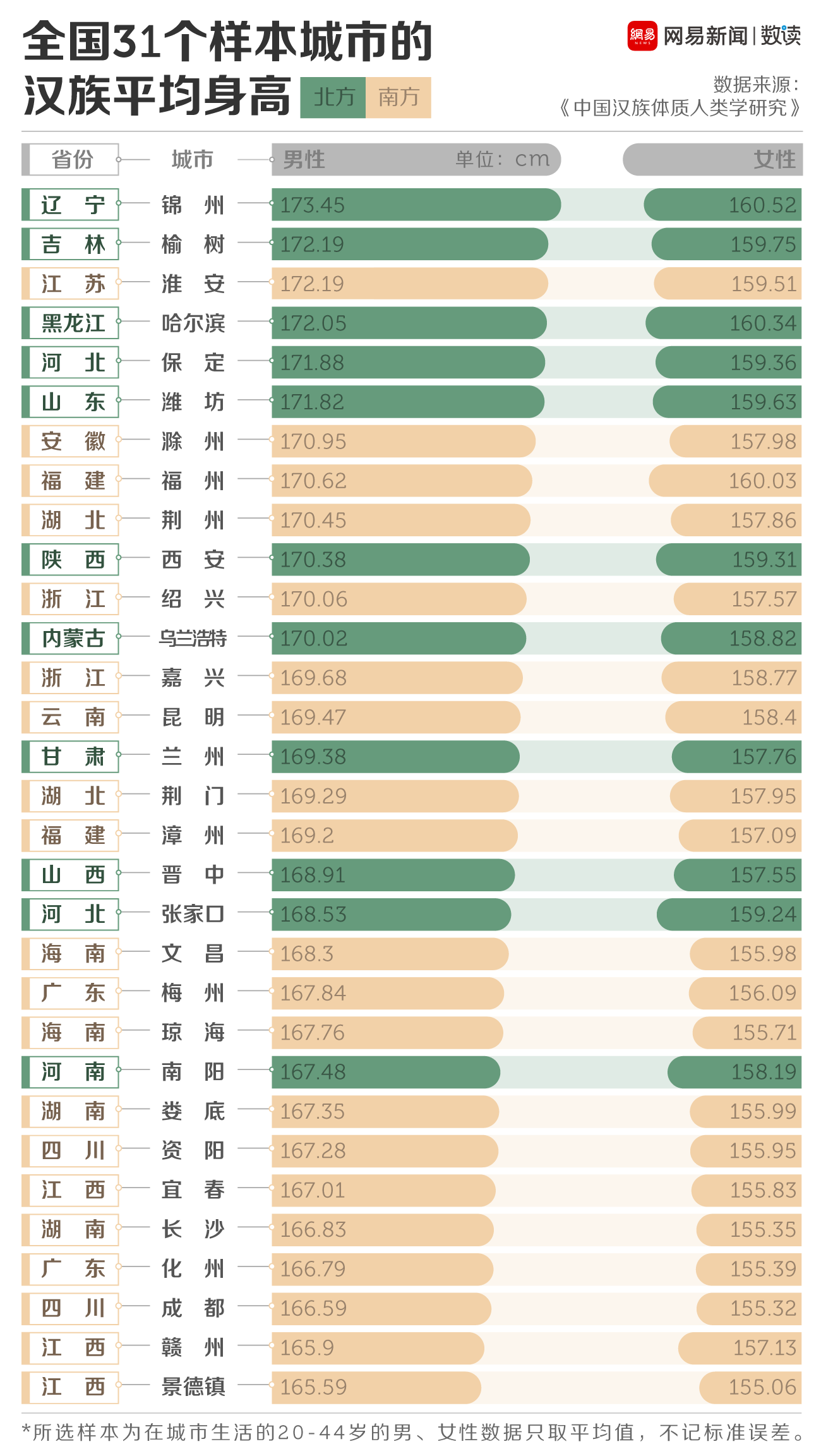 研究小组对31个样本城市调研后的数据表明,辽宁省锦州市的男性居民平均身高在样本城市中居首,20-44岁男性平均身高为173.45cm,女性为160.52cm。