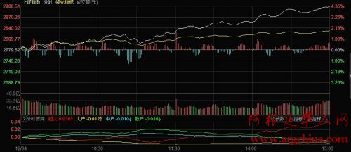 今日沪深两市高开,午后两市股指震荡高升。上证指数疯长近120点,尾盘一度站上2900点。深指突破1万点大关。两市成交量近9000亿元。截至收盘,上证综指收于2899.46点,涨119.93点,涨4.31%;深证成指收于10029.83点,涨385.91点,涨4.00%。创业板指收于1621.85点,涨1.08%。