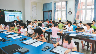 图为台湾省宜兰县北成小学的学生在上书法课。人民日报海外版台北3月15日电正是午休时间,台湾南投地检署的一位检察官却没有休息,他拿出了小学生作业簿,在方格纸上,一笔一划写...