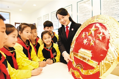 13日,山东沂南县双语红军小学学生来到县人民法院,听法官讲解宪法的基本知识,感受宪法和法律的威严与神圣。杜昱葆摄(人民视觉)《人民日报》(2018年03月16日15版)