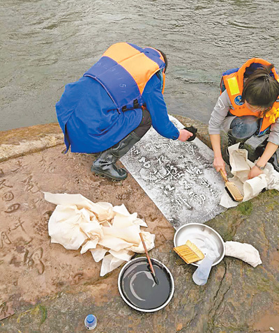 工作人员正在制作莲花石拓片。 重庆中国三峡博物馆供图长江重庆段水域中,隐藏着7个神秘的川江枯水题刻:江津莲花石、巴南迎春石、江北耗儿石、朝天门灵石、涪陵白鹤梁、丰都龙...