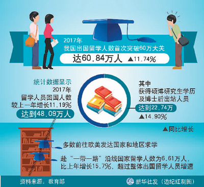 人民日报海外版北京3月30日电记者30日从教育部获悉,2017年,中国出国留学人数首次突破60万大关,达60.84万人,同比增长11.74%,持续保持世界最大留学生生源国地...