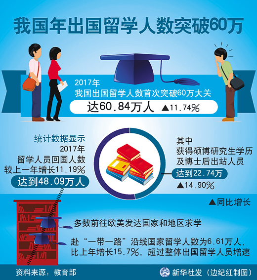 来自教育部的最新数据显示,改革开放40年来,中国各类出国留学人员累计已达519.49万人,目前有145.41万人正在国外进行不同阶段的学习和研究。2017年,中国出国留学人...