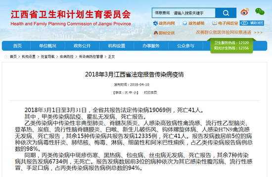 中国江西网讯4月11日,记者从江西省卫生计生委获悉,近日,江西省卫生计生委发布了3月江西省法定报告传染病疫情。2018年3月1日至3月31日,全省共报告法定传染病19069例,死亡41人。丙类传染病中,报告发病数居前3位的病种依次为其它感染性腹泻病、流行性感冒、手足口病,占丙类传染病报告病例总数的94%。