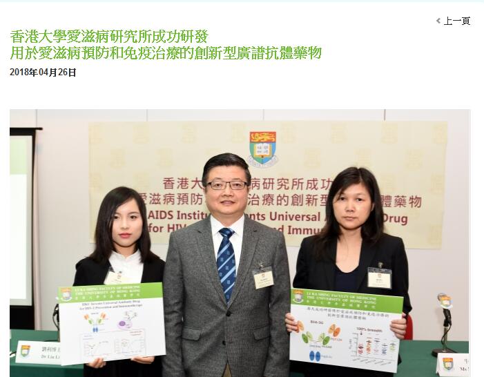 港大医学院微生物学系艾滋病研究所领导的研究团队,利用基因工程技术,研制出一种新型的抗体药物“串联双价广谱中和抗体”(BiIA-SG),可有效抑制所有测试过的艾滋病病毒株,并促进清除小鼠体内的潜伏感染细胞。