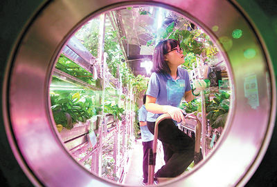 志愿者刘慧(前)在收集舱内种植的蔬菜,做出舱准备。 志愿者顺利出舱,并给大家带来“月宫”特产。5月15日,捧着亲手在“月宫”种植的大豆、小麦、胡萝卜、西红柿等粮食蔬菜...