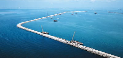 2018年4月28日在马来西亚关丹港新深水码头拍摄的防波堤。为配合马中关丹产业园区的发展,为入园项目提供优良的港口物流服务,广西北部湾国际港务集团有限公司入股关丹港后与马方合作伙伴一起加快了对关丹港的升级改造。