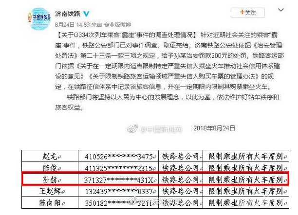 国家公共信用信息中心公布8月份新增失信联合惩戒对象公示,新增因严重失信行为而限制乘坐火车严重失信人247人。中新网记者注意到,孙赫出现在“黑名单”中,被限制乘坐所有火车席别。