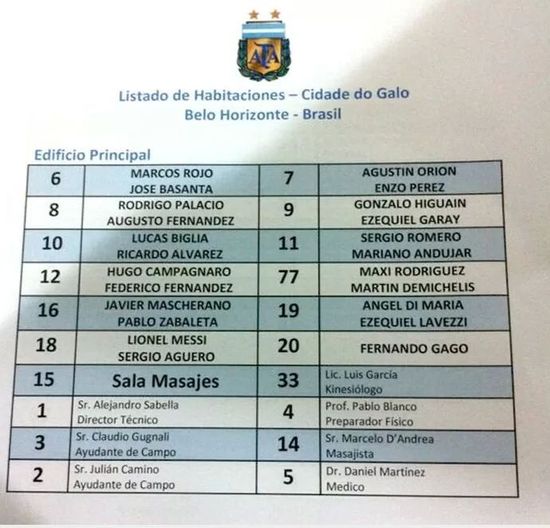 在周日下午的媒体开放会上,加洛城酒店宣布了阿根廷国家队的接待权,并且根据阿根廷客人们的各自特点专门布置了房间。房间门都贴上了球 星们的海报,在18号房间门上,梅西和阿圭罗双臂交叉于胸前并排而站。有意思的是,由于13和17在阿根廷文化里有不吉利的含义,所以阿根廷国家队管理层 把这两个房间门牌号更改成了33和77。