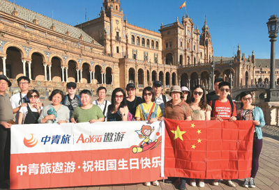 今年国庆黄金周,中国游客在西班牙祝福祖国。中青旅供图