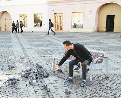 中国游客在罗马尼亚锡比乌广场休闲。新华社记者 陈进摄