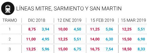 截止至目前,这些线路的最低票价均为5.75比索;明天(一月12日)起将涨至6.50比索;二月15日起将涨至7.25比索;最终在三月涨至8比索。