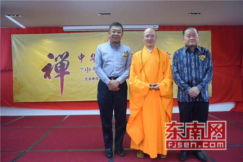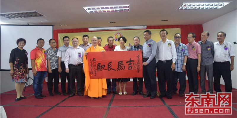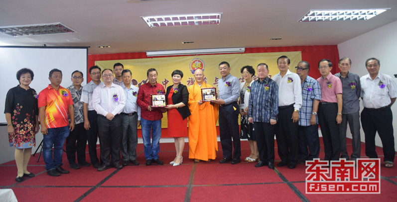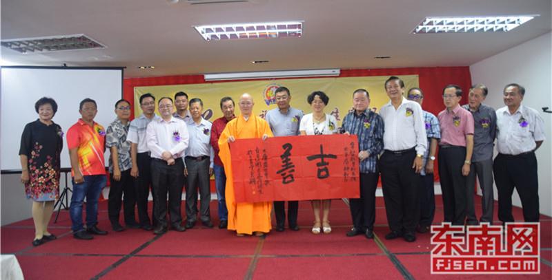 现场合影。图为世界福州十邑同乡总会执行会长、马来西亚福州社团联合总会总会长拿督斯里刘为强太平局绅(右),晋汉连省华总会长、古晋福建公会主席兼大会主席拿督黄良杰(左),以及福建省政协常委、福建佛学院院长、福州开元寺方丈本性禅师(中)。