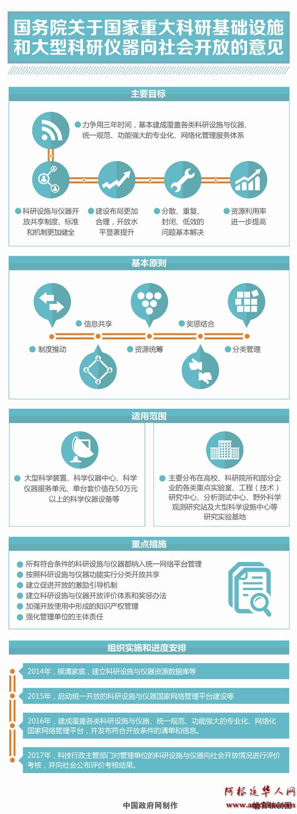《意见》明确了改革的组织实施和进度安排,提出到2015年启动统一开放的科研设施与仪器国家网络管理平台建设;到2016年,所有符合条件的科研设施与仪器纳入国家网络管理平台管理;到2017年,对管理单位的科研设施与仪器向社会开放情况进行评价考核,并向社会公布评价考核结果。