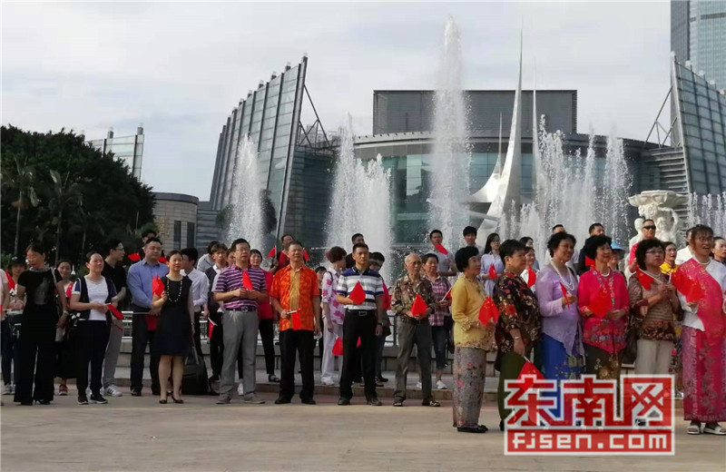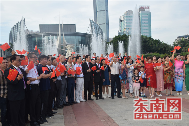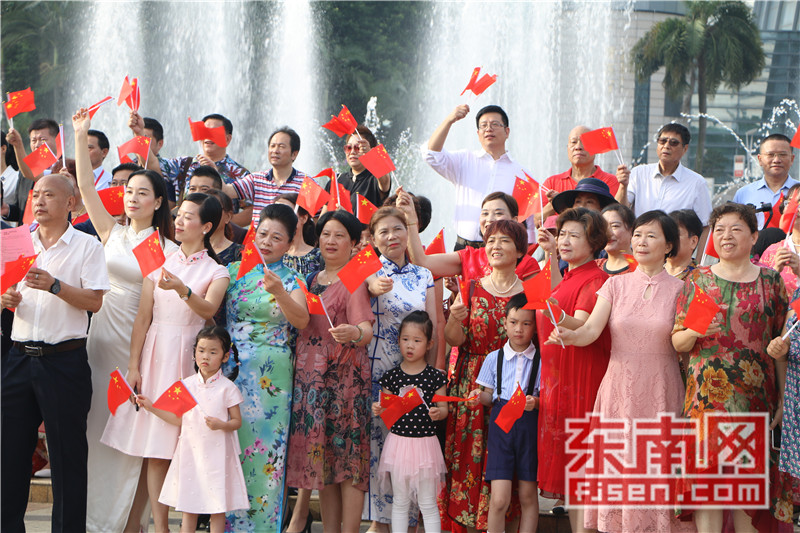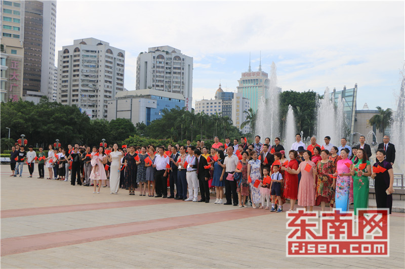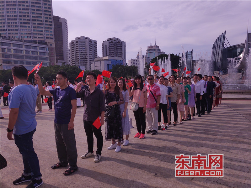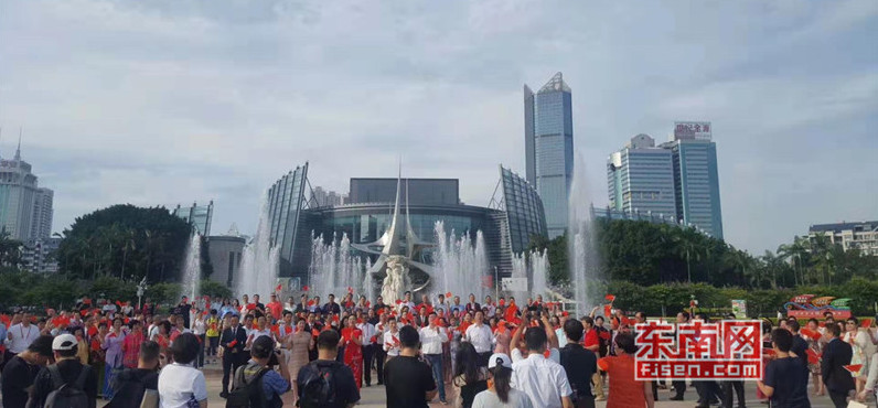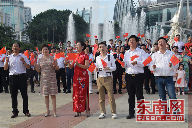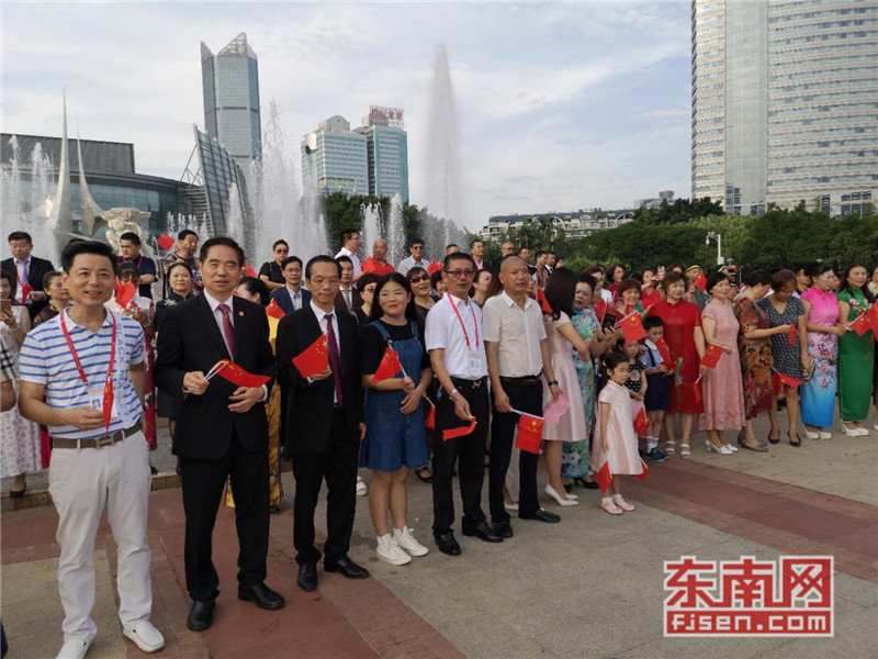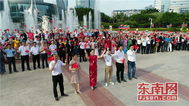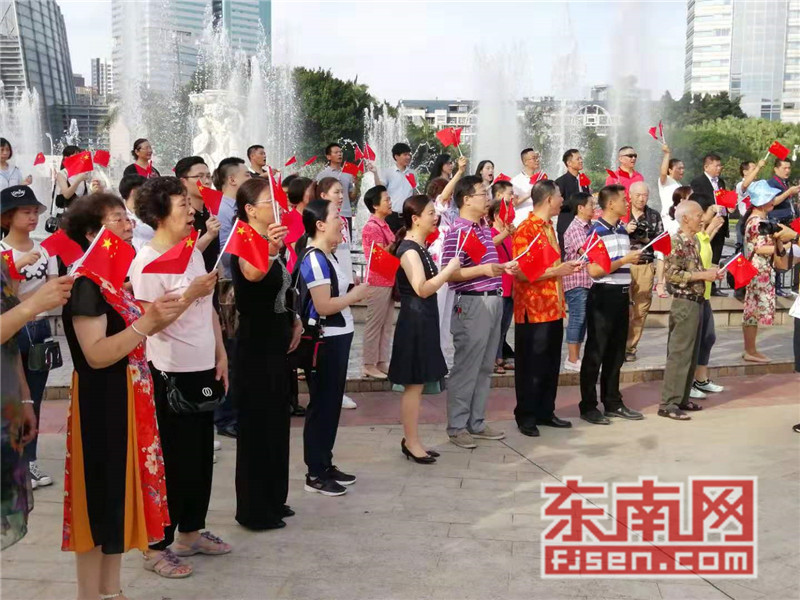 东南网6月19日讯(本网记者夏芳 陈倩 实习记者余雪林 文/图)每天清晨,福州市国旗护卫队都会护送国旗到五一广场国旗杆下,迎着第一缕阳光,伴随着国歌,将五星红旗冉冉升起。今日,来自全球5大洲70多个国家的海外侨胞、港澳同胞、归侨侨眷及现场市民近600人参加了这场肃穆庄严的奏国歌、升国旗仪式,并且在五一广场开展了一场别开生面的公益快闪活动。