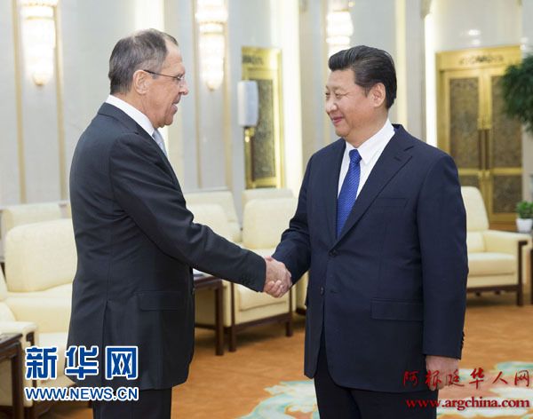 拉夫罗夫向习近平转达了普京总统的良好祝愿和亲切问候。他表示,去年俄中两国元首5次会晤,两国领导人在最高层达成的共识,给两国关系发展指明了方向。俄中合作对维护世界和平稳定非常重要。俄方将与中方一道办好纪念第二次世界大战胜利70周年相关活动,共同捍卫联合国宪章原则和宗旨。