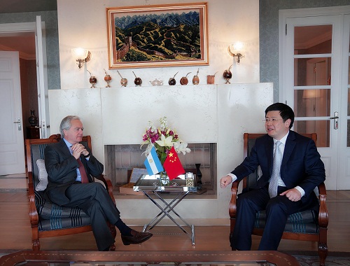 2019年9月23日,驻阿根廷大使邹肖力在官邸会见临时参议长皮内多。邹大使表示,近年来,在习近平主席和马克里总统的亲自关心和推动下,中阿全面战略伙伴关系取得前所未有的发展,各领域务实合作成果丰硕,给两国人民带来实实在在的利益。当前,阿经济金融形势面临一些困难,但中方对阿未来发展充满信心,也对中阿双边关系的前景充满信心。面向未来,中方将同阿方携手努力,落实好两国元首达成的一系列共识,在新时期以更宽广视野谋划双边关系发展蓝图,推动中阿友好合作迈上新台阶。