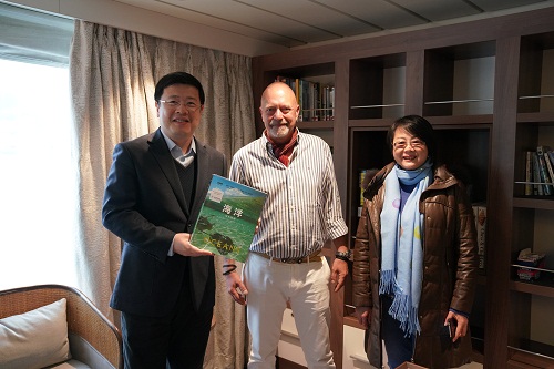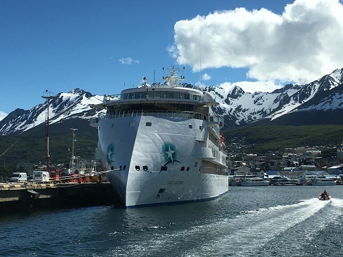 2019年10月30日,驻阿根廷大使邹肖力参观了停泊在乌斯怀亚港口的首艘由中国船厂建造的极地探险游轮。游轮运营商澳大利亚“极光”游轮公司极地探险部经理霍利克全程陪同并介绍相关情况。