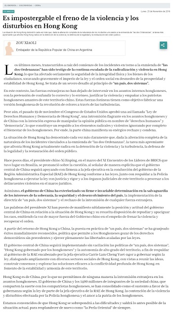 2019年11月25日,驻阿根廷大使邹肖力在阿主流媒体《纪事报》发表题为《止暴制乱刻不容缓》的署名文章。