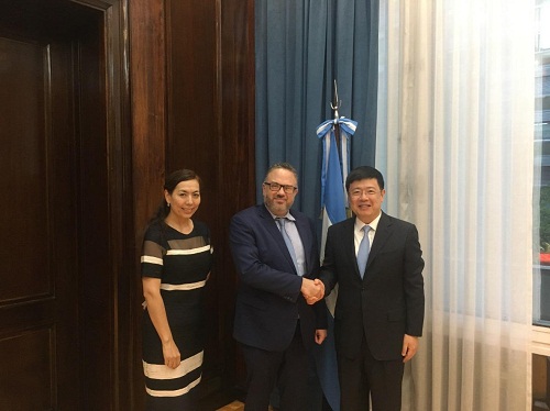 12月26日,驻阿根廷大使邹肖力在阿生产发展部会见新任部长库尔法斯。