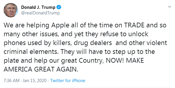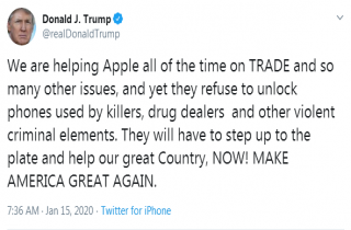 【环球网快讯】美国总统特朗普刚刚在推特上发文炮轰苹果公司。当地时间14日,特朗普发推文说:“我们一直在贸易和其他许多问题上帮助苹果,但他们(苹果)却拒绝解锁杀人犯、毒贩和暴力犯罪分子们使用的手机。他们现在必须挺身而出,帮助我们这个伟大的国家!”在推文的最后,他又重复了自2016年美国大选就开始使用的口号:“让美国再次伟大。”(MAKE AMERICA GREAT AGAIN. )