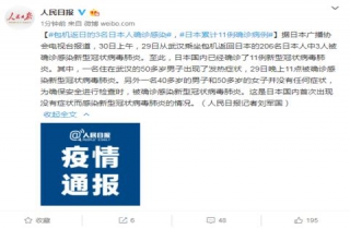 据日本广播协会电视台报道,30日上午,29日从武汉乘坐包机返回日本的206名日本人中3人被确诊感染新型冠状病毒肺炎。至此,日本国内已经确诊了11例新型冠状病毒肺炎。其中,一名住在武汉的50多岁男子出现了发热症状,29日晚上11点被确诊感染新型冠状病毒肺炎。另外一名40多岁的男子和50多岁的女子并没有任何症状,为确保安全进行检查时,被确诊感染新型冠状病毒肺炎。这是日本国内首次出现没有症状而感染新型冠状病毒肺炎的情况。(人民日报记者刘军国)