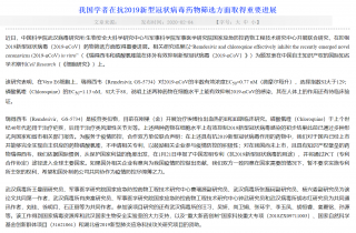 2月4日,中科院武汉病毒所官网发表文章《我国学者在抗2019新型冠状病毒药物筛选方面取得重要进展》。