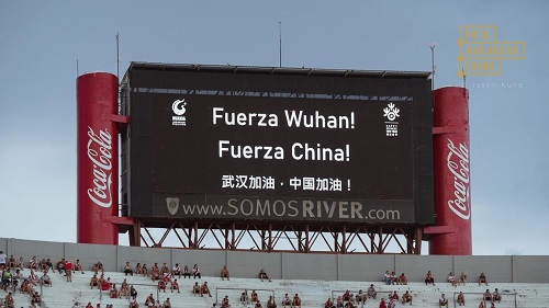 2020年2月16日晚,在阿根廷老牌足球劲旅河床俱乐部主场,进行了一场不同寻常的足球比赛。作为今年驻阿根廷使馆“欢乐春节”系列活动之“中国春节文化之旅”的合作方,河床俱乐部以其独有的方式表达了对中国抗击新冠肺炎疫情的大力支持,为中国加油,为武汉加油!