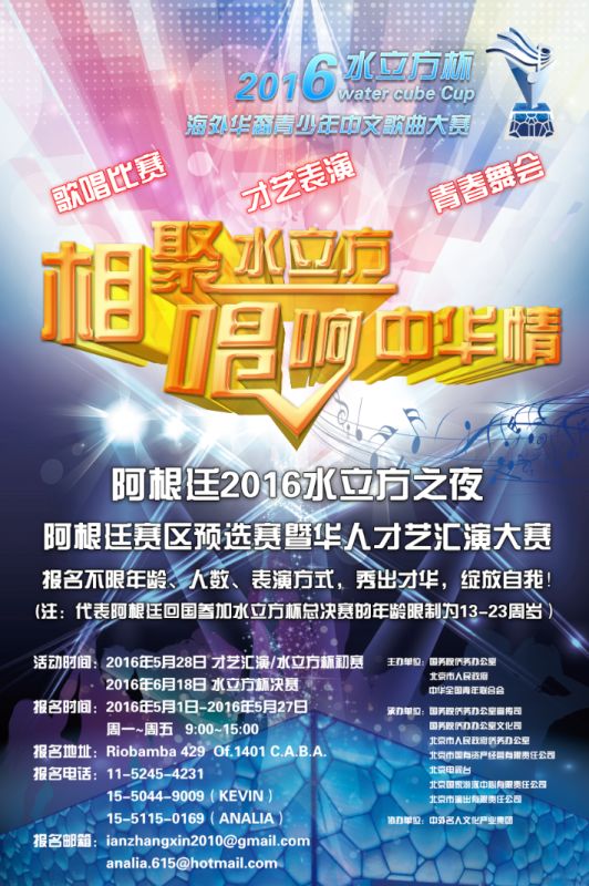 阿根廷2016“水立方之夜” 华人才艺汇演汇演和“水立方”杯歌曲大赛初赛时间定于5月28日举办,举办地址另行通知。