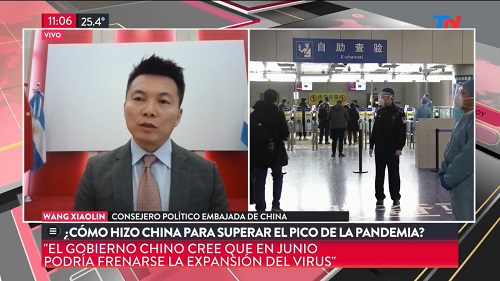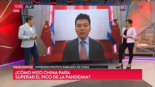 2020年3月13日,驻阿根廷使馆政务参赞王晓林接受阿根廷主流媒体TN新闻电视台直播连线专访,详细介绍中国新冠肺炎疫情防控积极向好态势及当前经济社会形势,并就新冠病毒起源、中国为全球疫情防治所作的贡献及中阿防疫合作等回答该电视台知名主持人洛沃提问。