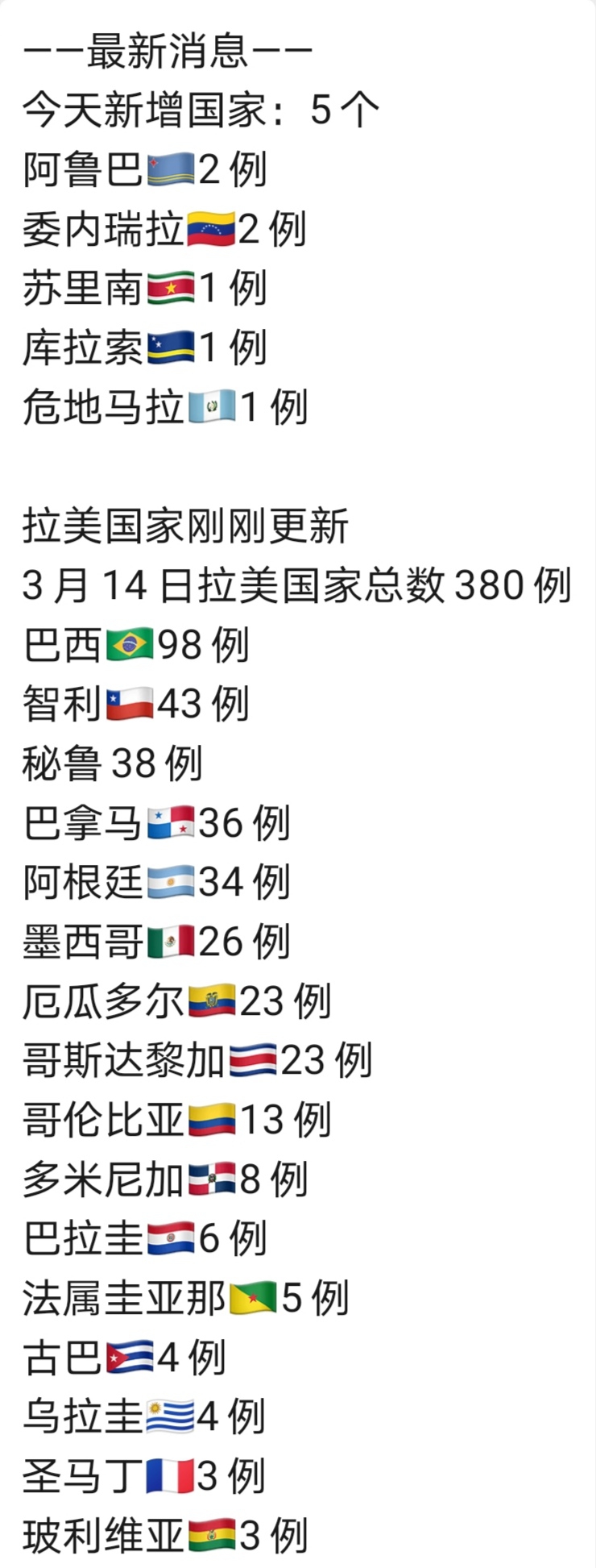拉美疫情最新汇总,3月14日拉美国家总数380例 阿根廷华人网 • 2020-03-14 14:06• 收藏本文 ——拉美国最新消息————最新消息——今天新增国家:5个阿鲁巴 转载本网稿件,原则上需要书面授权,不得篡改稿件主题。本网随时有权要求第三方停止侵权行为。 本网所载内容或图片,若涉及侵权,请联系删除。 14 ___________ 2020/03 拉美疫情最新汇总,3月14日拉美国家总数380例 ——拉美国最新消息——今天新增国家:5个阿鲁巴 [ 微信长按识别二维码或扫码查看分享内容 ]