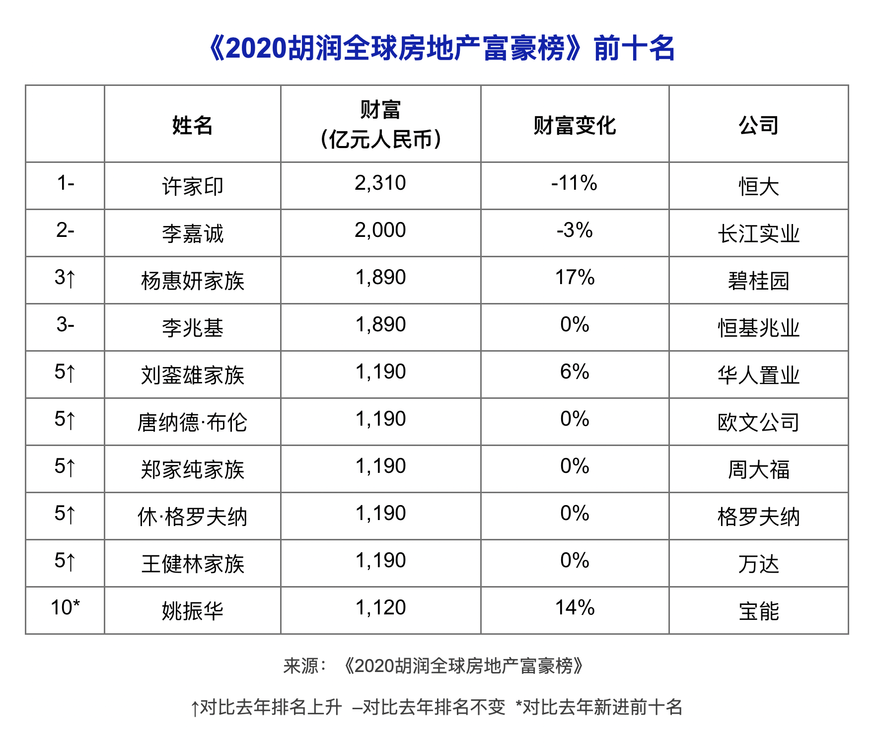 在榜单的前十名中,共有8位来自中国。其中,前三名也全部来自中国,分别为恒大的许家印、长江实业的李嘉诚和碧桂园的杨惠妍家族。