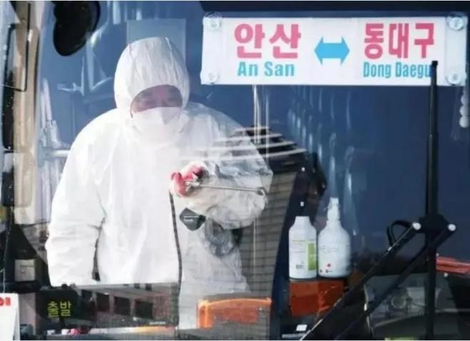 韩国防疫人员在消毒车辆