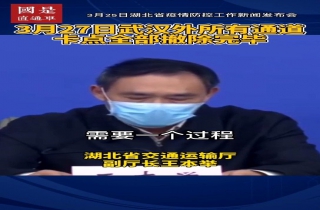 【3月27日武汉外所有通道卡点全部撤除完毕】湖北省交通运输厅副厅长王本举表示,卡口撤除工作需要一个过程,3月25日起开始有序解除武汉外离鄂通道管控,3月27日0时武汉以外所有通道卡点全部撤除完毕。他强调“有序”二字,并希望大家理解配合。