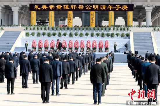 4月4日,庚子(2020)年清明视频公祭轩辕黄帝典礼在陕西黄陵举行。图为典礼开始前,参祭人员集体默哀,表达对抗击新冠肺炎疫情斗争牺牲烈士和逝世同胞的深切哀悼。