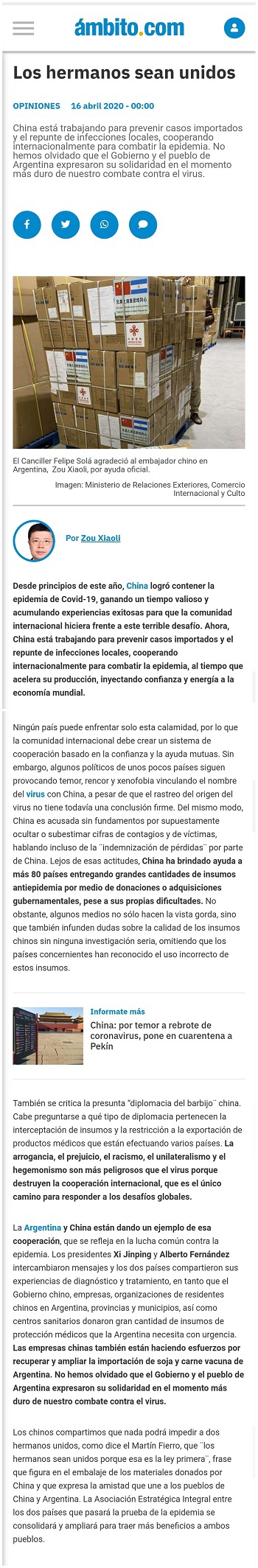 2019年4月16日,驻阿根廷大使邹肖力在阿主流媒体《金融界报》发表题为《兄弟之道是团结同心》的署名文章。