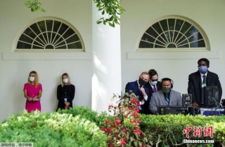 资料图:当地时间5月11日,美国白宫举行了关于新冠肺炎的新闻发布会,白宫新闻秘书和其他白宫工作人员、记者以及美国军方成员均佩戴口罩出现在白宫玫瑰花园参加发布会。