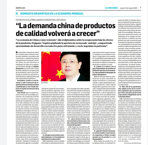 近日,驻阿根廷大使邹肖力接受阿根廷主流媒体《金融界报》专访,重点介绍当前中国经济发展形势、中阿经贸合作等情况。专访内容于5月14日在该报发表。
