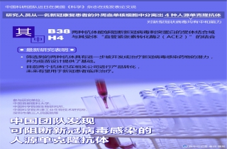 中国首都医科大学、中国科学院微生物研究所、中国科学院天津工业生物技术研究所、深圳市第三人民医院等多家单位参与这项研究。研究人员从一名新冠康复患者的外周血单核细胞中分离出4种人源单克隆抗体。实验显示,这4种抗体对新型冠状病毒均有中和能力。其中,分别被称为B38和H4的两种抗体能够阻断新冠病毒刺突蛋白的受体结合域与其受体“血管紧张素转化酶2(ACE2)”的结合。