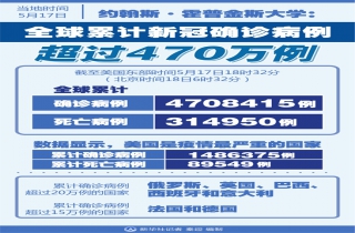 新华社纽约5月17日电 美国约翰斯·霍普金斯大学17日发布的新冠疫情最新统计数据显示,全球累计确诊病例超过470万例。