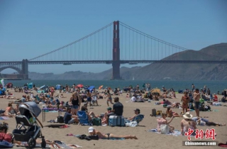 当地时间5月25日,美国旧金山市民在金门大桥附近的海滩纳凉。 中新社记者 刘关关 摄