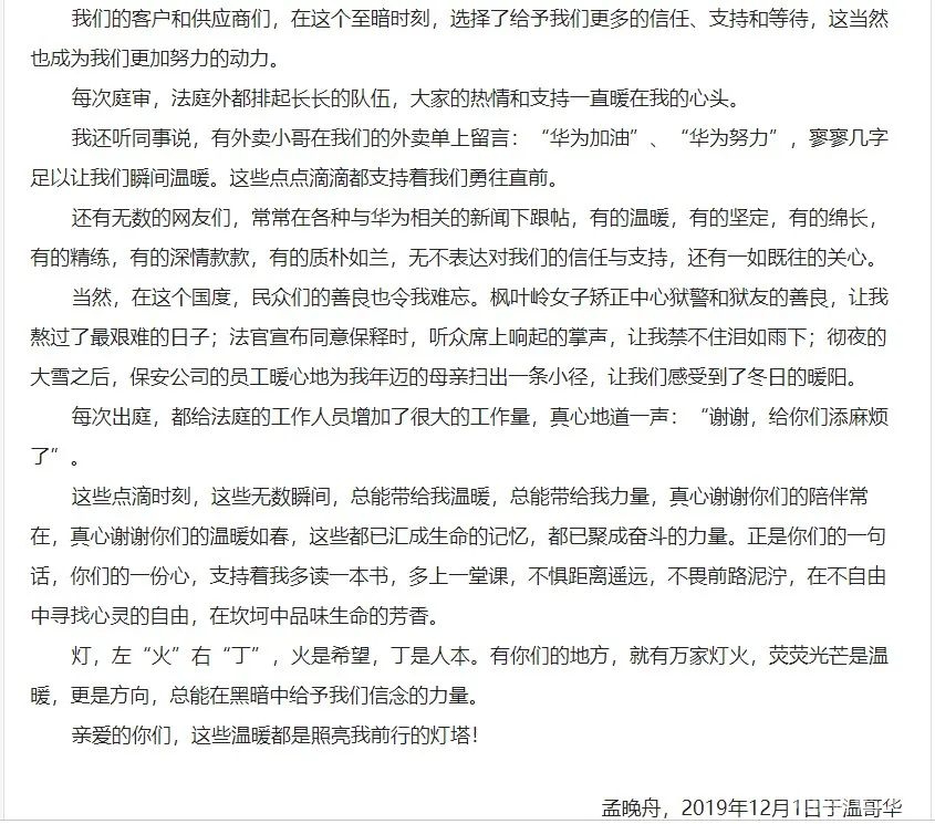 12月2日,在被加拿大拘押一周年之际,孟晚舟发布一封公开信,称忙碌把时光缩短,苦难把岁月拉长。自己学会了坚强承受、从容面对,感谢大家对她的温暖和鼓励。