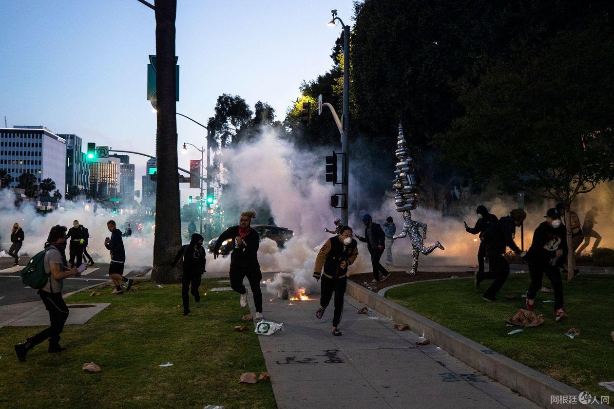 ▲美国洛杉矶比弗利山,示威者躲开警方的催泪弹。图据《华尔街日报》