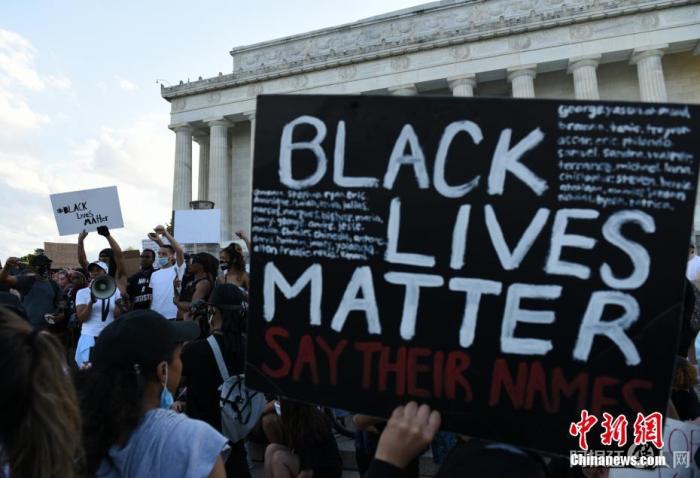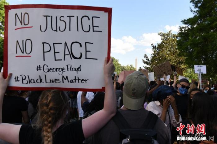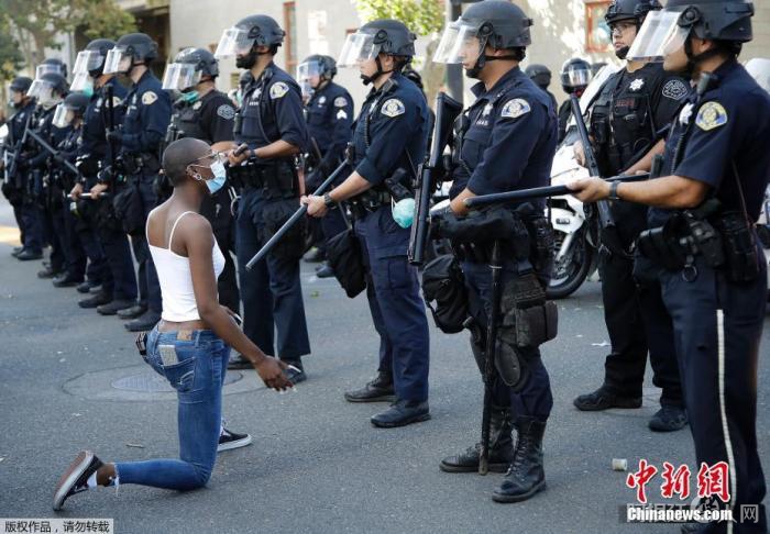 这是非裔美国人弗洛伊德遭暴力执法死亡后,发生在美国反种族歧视抗议现场的一幕。