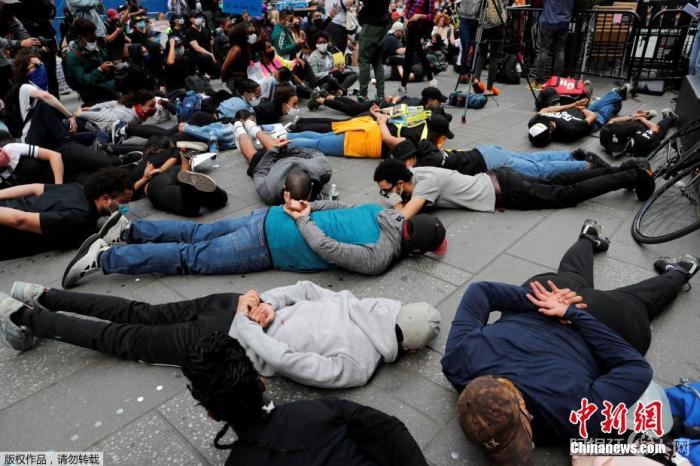 在华盛顿特区,抗议者躺在街道上,高喊着弗洛伊德生前的遗言——“我无法呼吸”。