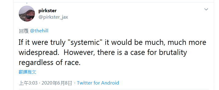 网友pirkster称,如果问题真的是“系统性的”,那么其范围会更加广泛,然而(现在)无关种族,是暴行的问题。↓
