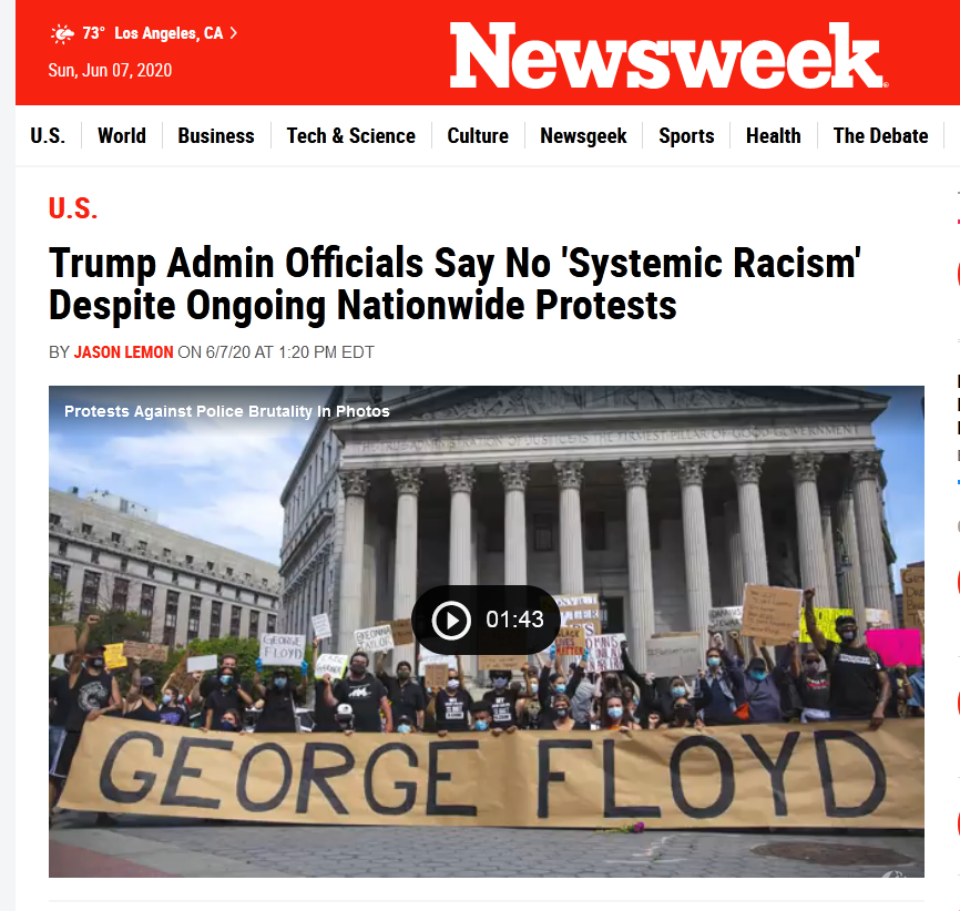 5月25日,黑人男子弗洛伊德在遭警察执法期间死亡,随后,全美各地与世界多国都举行了大规模的示威活动。据《新闻周刊》报道,抗议者提到,许多人认为警务与司法系统存在系统性的种族主义,他们敦促采取重大行动与进行改革来解决该问题。