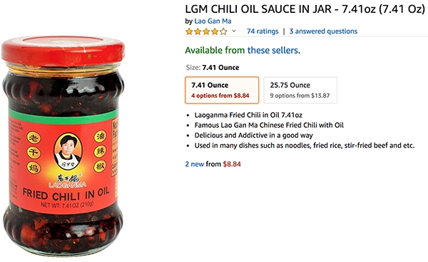 老干妈的系列产品在国内的售价不超过15元,但到了海外,老干妈产品的价格就没那么亲民了。亚马逊美国站网站上一瓶210克的老干妈辣酱售价最低也要8.84美元,近人民币50元。